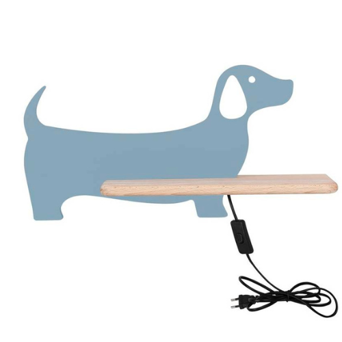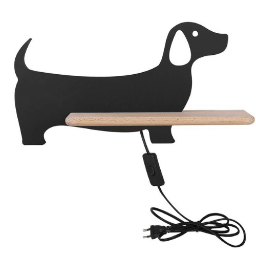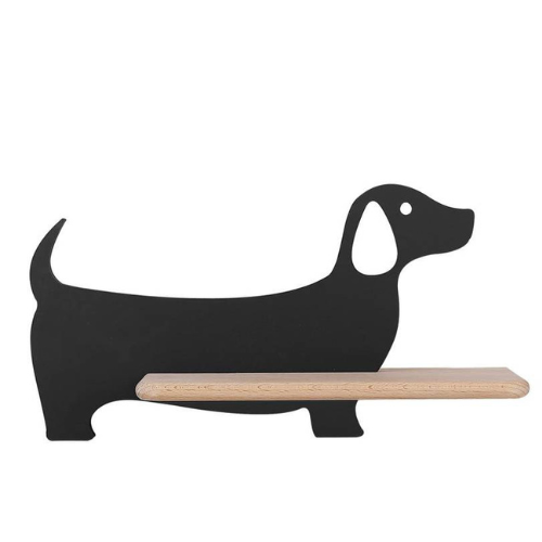 Este compusă dintr-o poliță realizată din lemn și MDF în culoare naturală și dintr-un element realizat din metal în formă de câine, disponibil în trei variante de culoare la alegere: albastru, roz sau negru.