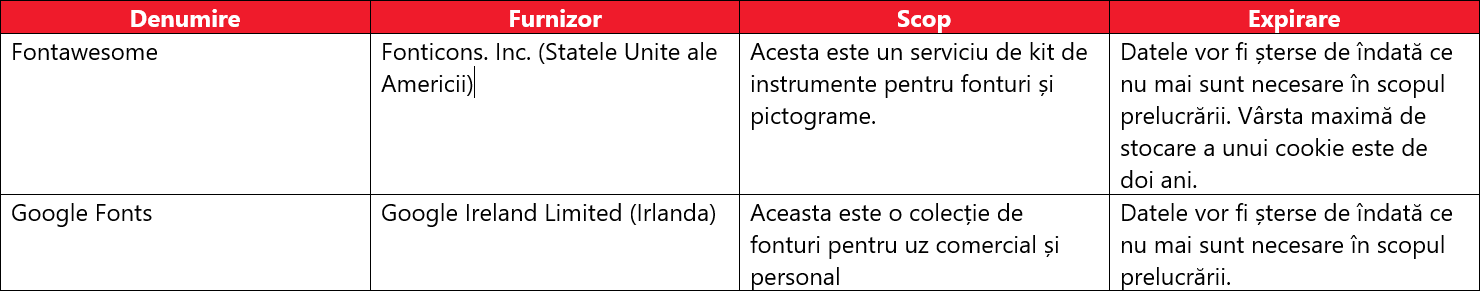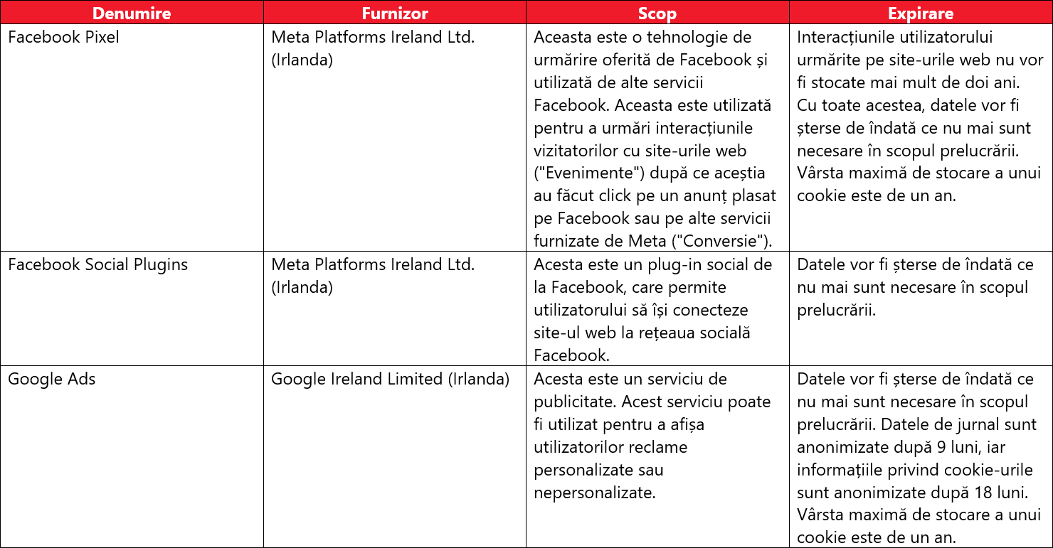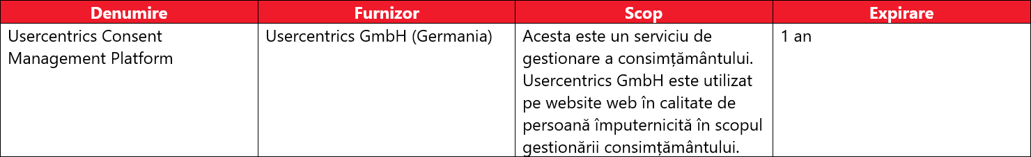 Acest Website utilizează cookie-urile prevăzute mai jos. Totodată, este descris și scopul utilizării acestor cookie-uri, durata de stocare a lor, dar și persoanele care le furnizează.