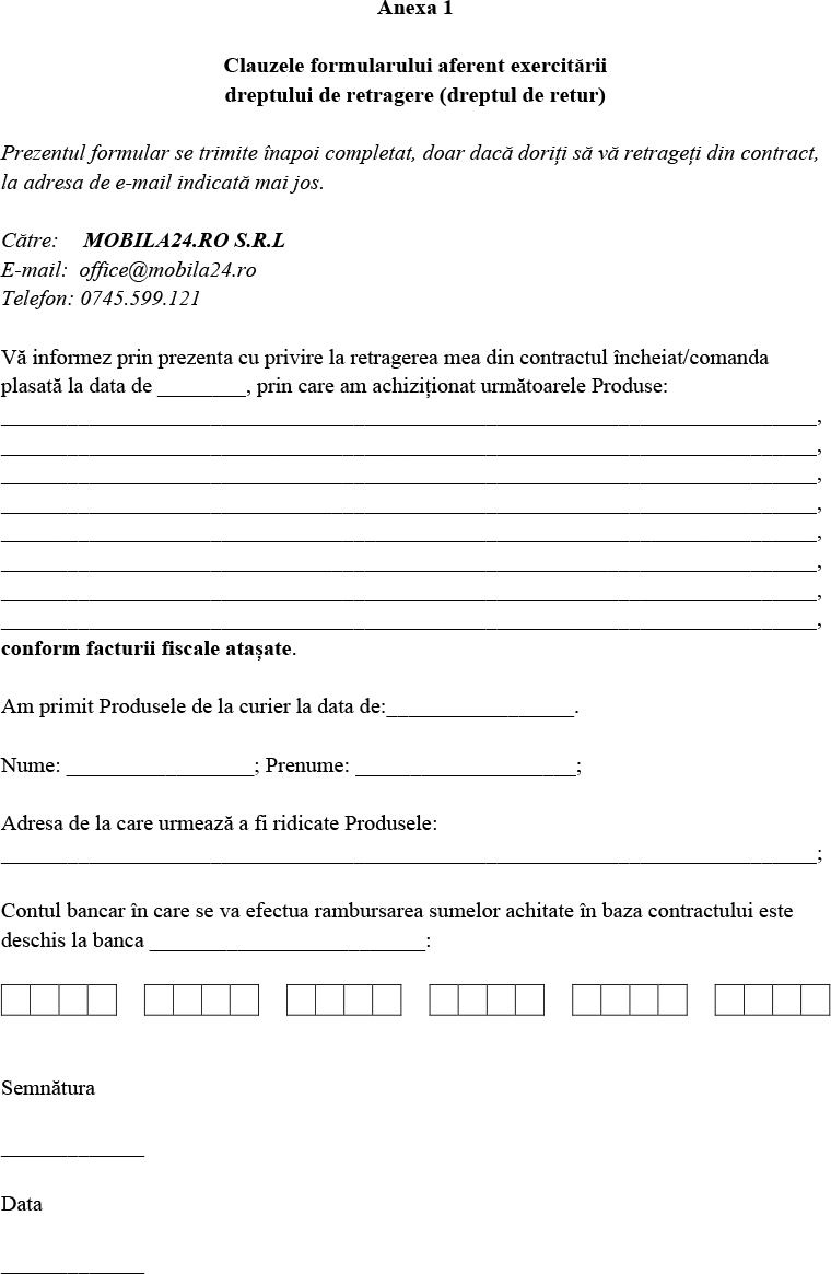 9. Pentru celelalte Produse, care nu se încadrează în una dintre cele patru categorii de mai sus, dacă aveți calitatea de Consumator, vă puteți exercita dreptul de retragere prin intermediul formularului de retur disponibil pe Website, la adresa: https://www.mobila24.ro/product-return-generator, contactându-ne la numărul de telefon afișat sau prin intermediul e-mail-ului: office@mobila24.ro. În măsura în care optați pentru transmiterea formularului prin e-mail, este necesar să completați formularul de retur prevăzut în Anexă și să îl transmiteți Societății la adresa de e-mail office@mobila24.ro sau să ne indicați prin e-mail numărul facturii primite, Produsul pe care dorți să îl returnați, adresa dumneavoastră de e-mail și adresa de ridicare a Produsului. După transmiterea acestuia, veți primi un mail de confirmare a solicitării efectuate.