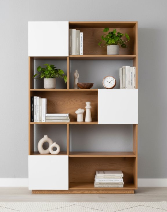 Biblioteca Nevada cu lungimea de 110 cm, de la Avida Design, este o piesă de mobilier modernă care combină căldura culorii stejarului natural cu accentele moderne de alb, fiind potrivită pentru interioarele luminoase, minimaliste.