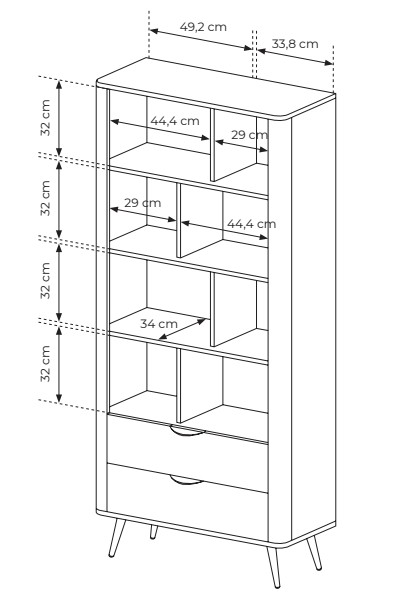 Piesa este dotată cu două uși cu balamale în spatele cărora se ascunde un spațiu generos de depozitare cu numeroase rafturi pentru cărți, textile sau veselă.