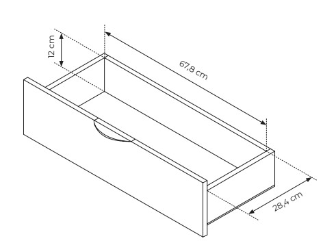 Piesa este dotată cu 2 uși cu balamale în spatele cărora se ascund numeroase rafturi, precum și cu 3 sertare cu extinere completă pentru depozitarea documentelor, textilei sau veselei.