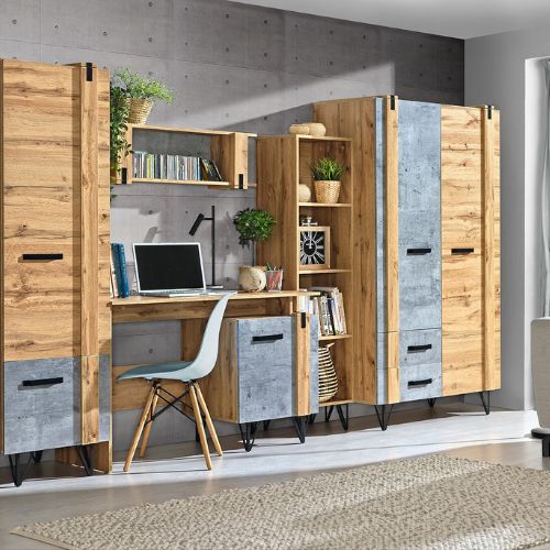 Biroul cu ușă și raft deschis Lofter Lo9, în culorile stejar wotan și beton millenium, de la Dolmar, are o estetică industrială rafinată, care va redefini oricare amenajare interioară contemporană.