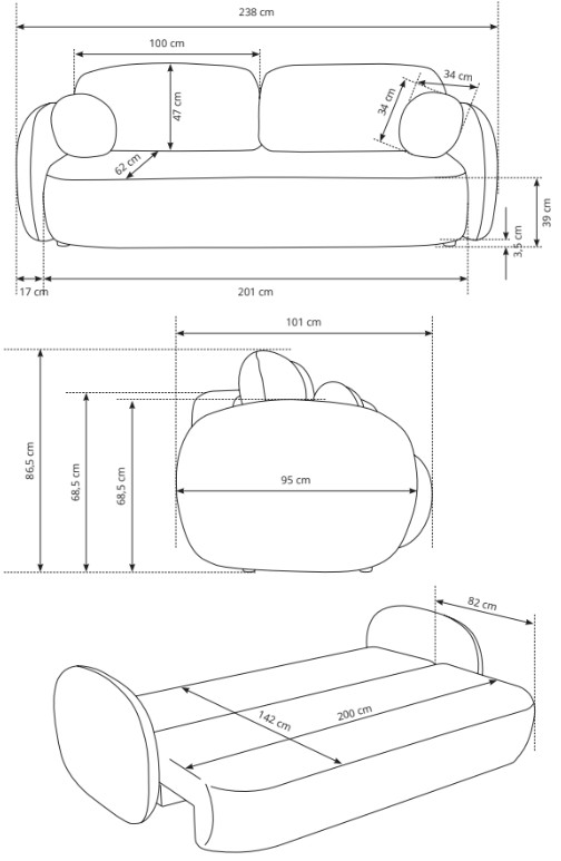 Canapeaua extensibilă pentru 3 persoane Domino de la Gabi este echipată cu o funcție de extensie cu mecanism DL, care îți permite să ridici cu ușurință șezutul și să cobori spătarul, transformând-o într-un pat confortabil.