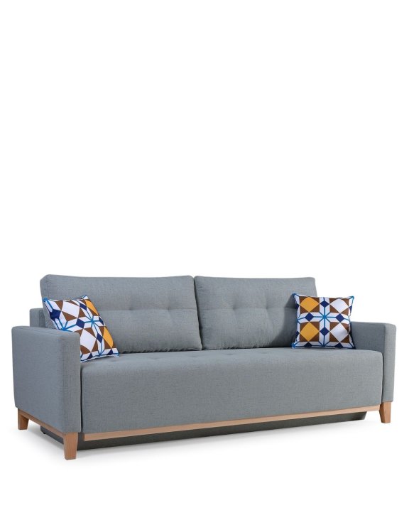 Canapeaua are o bază din lemn și picioare de 13,5 cm înălțime, ceea ce îi conferă un aspect rustic, natural, de inspirație boho-chic.