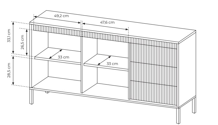Dotată cu două compartimente cu rafturi interioare și cu trei sertare practice cu deschidere prin apăsare („push-to-open”), este ideală pentru depozitarea diverselor obiecte, precum veselă, haine sau documente.