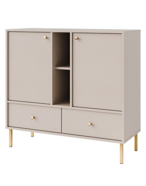 Comoda cu 2 uși, 2 sertare și 2 rafturi deschise Tokyo 2, în culoarea bej nisipiu, de la Stolarz Lempert, va aduce un suflu nou în amenajarea casei tale.