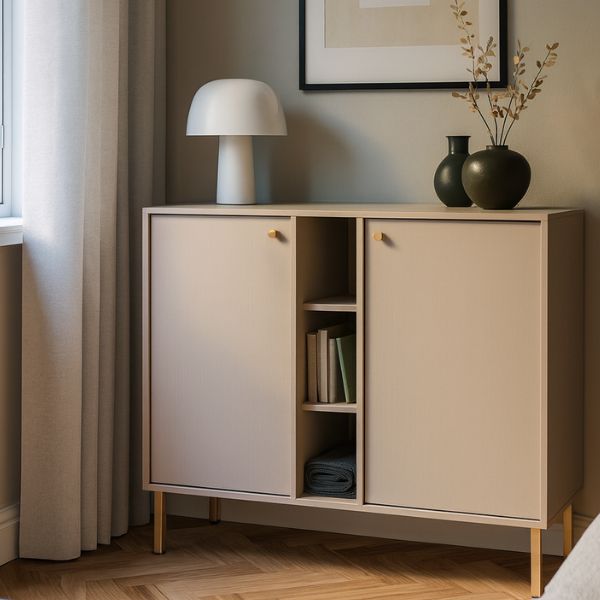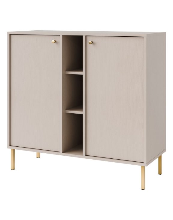 Comoda cu 2 uși și 3 rafturi deschise Tokyo 2, în culoarea bej nisipiu, de la Stolarz Lempert, va aduce un suflu nou în amenajarea casei tale.