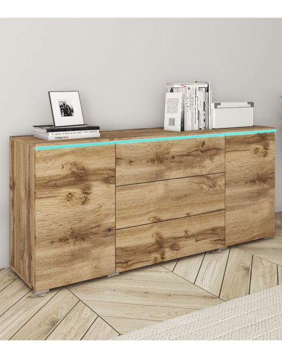 Comoda cu 2 uși și 3 sertare Vera, în culoarea stejar wotan, de la Bratex, este o piesă de mobilier modernă, care combină funcționalitatea cu un aspect distinctiv.