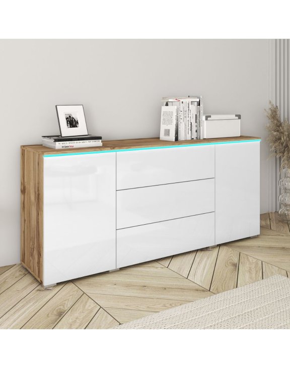 Comoda cu 2 uși și 3 sertare Vera, în culorile stejar wotan/alb lucios, de la Bratex, este o piesă de mobilier modernă, care combină funcționalitatea cu un aspect distinctiv.