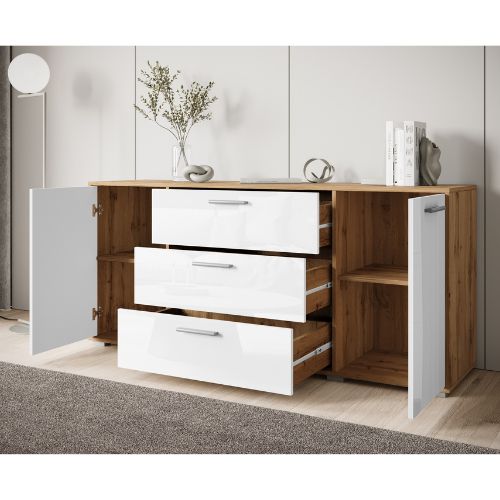 Comoda cu 2 uși și 3 sertare Bogota, în culorile alb lucios și stejar wotan, de la Bratex, este o soluție practică și elegantă de depozitare pentru sufragerie, birou, dormitor etc.