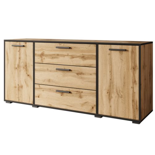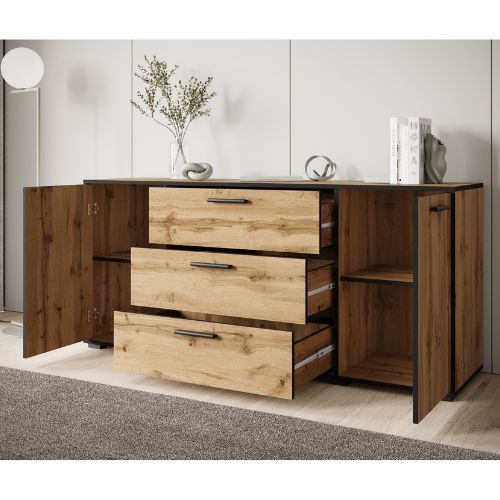 Comoda cu 2 uși și 3 sertare Bogota, în culorile stejar wotan și grafit, de la Bratex, este o soluție practică și elegantă de depozitare pentru sufragerie, birou, dormitor etc.
