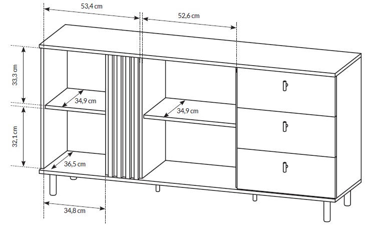 Este compartimentată în mod inteligent, cu o ușă care ascunde un spațiu practice pentru obiectele mai voluminoase, dar și cu sertare compacte, potrivite pentru articole mai mici. De asemenea, are două rafturi deschise cu orificii pentru cabluri unde poți păstra și expune dispozitivele multimedia.