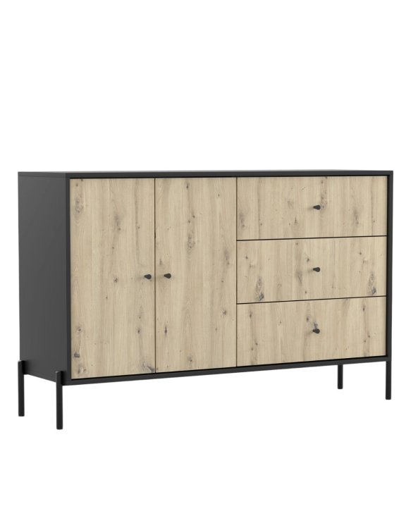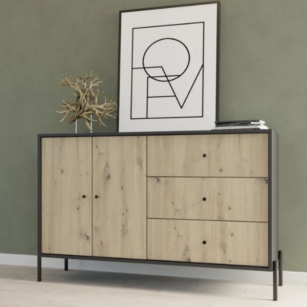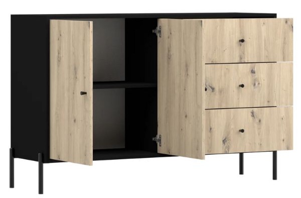 Părțile laterale și blatul în negru, combinate cu ușile de culoarea stejarului artizanal, creează un contrast rafinat care îi conferă piesei un farmec aparte.