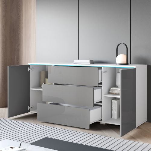 | Comodă cu 2 uși și 3 sertare Vera, alb/gri lucios (150 cm) | 1336 RON |