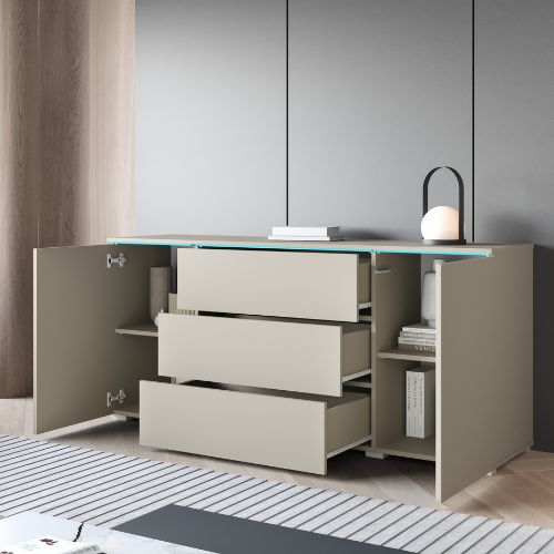 Comoda este dotată cu trei sertare spațioase și două compartimente laterale cu rafturi interioare, oferind un spațiu amplu de depozitare.
