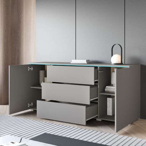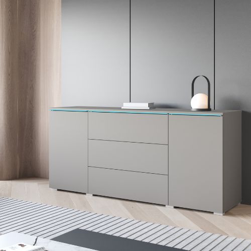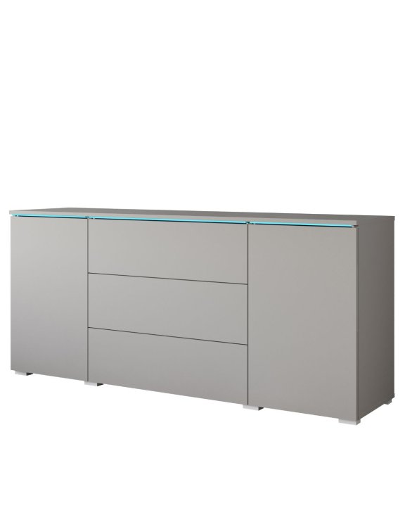 Comoda cu 2 uși și 3 sertare Vera, în culoarea gri paladiu, de la Bratex, este o piesă de mobilier modernă, care combină funcționalitatea cu un aspect distinctiv.