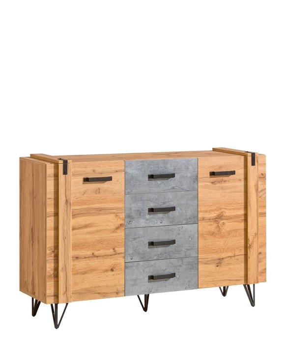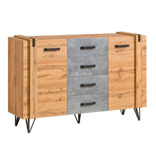 Comoda cu 2 uși și 4 sertare Lofter Lo5, în culorile stejar wotan și beton millenium, de la Dolmar, are o estetică industrială rafinată, care va redefini oricare amenajare interioară contemporană.
