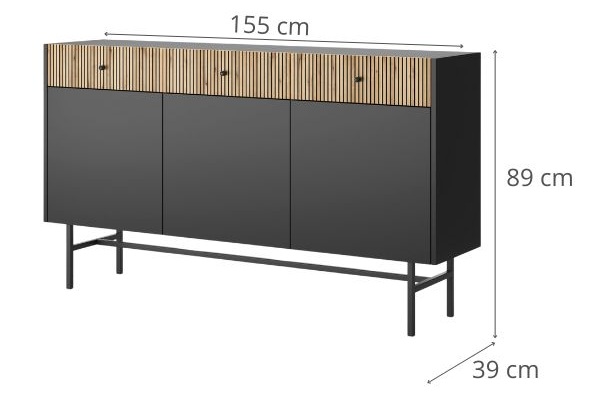Comoda cu 3 sertare și 3 compartimente Diva neagră cu accente în culoarea stejarului de la Karol combină rafinamentul modern cu funcționalitatea, oferind un spațiu dedicat și organizat pentru diverse obiecte.