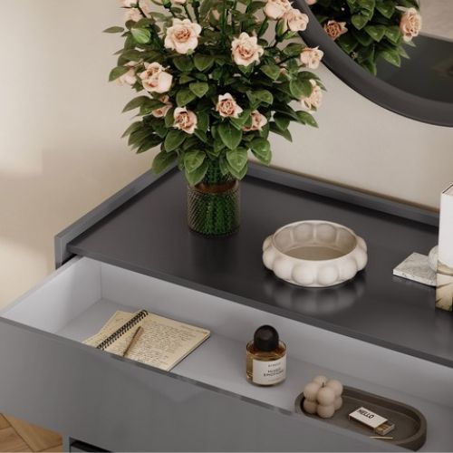 Blatul ușor adâncit este perfect pentru decorațiuni, precum o lampă, o vază cu flori sau chiar o oglindă pentru a crea un colț de înfrumusețare, în timp ce sertarele compacte păstrează lucrurile personale organizate și ferite de priviri.
