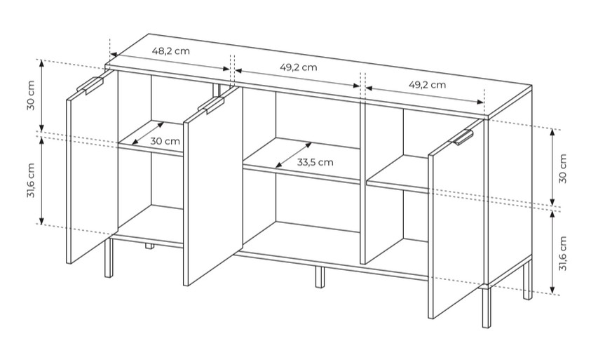 Comoda dezvăluie o compartimentare inteligentă, având patru compartimente generoase cu rafturi interioare. Având compartimente în loc de sertare, poate găzdui obiecte mai voluminoase decât o comodă obișnuită.