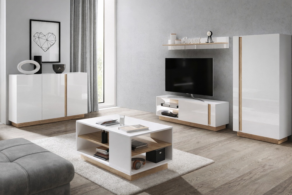 Este format dintr-o vitrină înaltă, o vitrină joasă, o comodă TV și un raft de perete, formând o unitate de perete armonioasă.