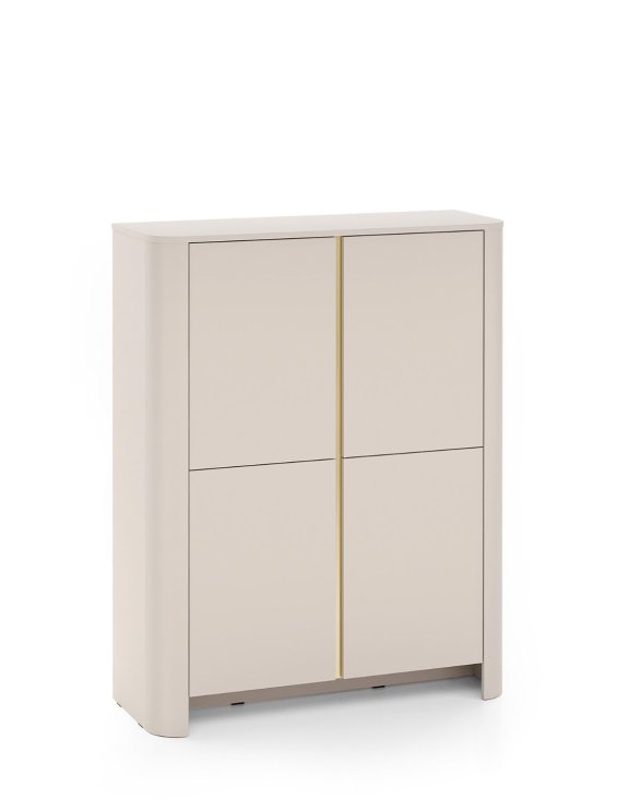 Comoda înaltă Bari cașmir cu accente aurii de la Piaski este o soluție elegantă de depozitare pentru sufragerie, dormitor sau birou, combinând aspectul modern cu funcționalitatea.