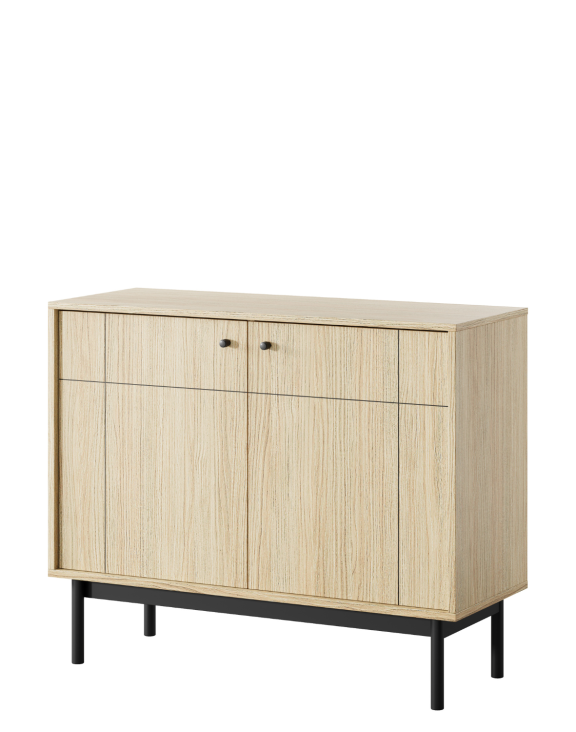 Mânerele tip „buton" din metal negru și picioarele din lemn vopsite în negru îi adaugă un aer modern, contrastând cu finisajul natural de stejar Linea.