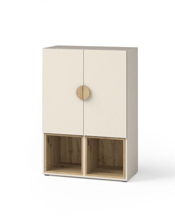 Comoda este echipată cu două uși cu balamale care ascund rafturi interioare și cu rafturi deschise menite să asigure o organizare inteligentă a obiectelor stocate.