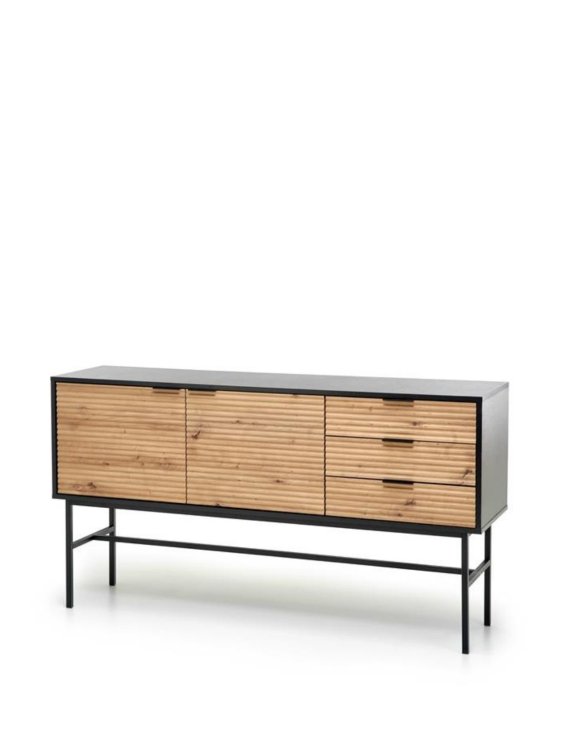 Comoda este fabricată din MDF furniruit și din plăci de mobilier, iar baza este realizată din metal acoperit cu pulbere.