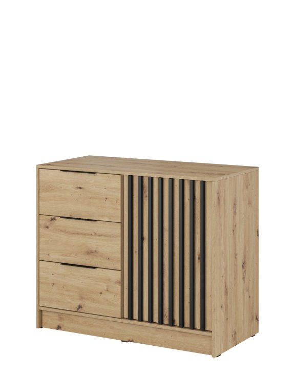 Culoarea stejarului artizanal și lamelele verticale decorative negre îi oferă un contrast elegant.