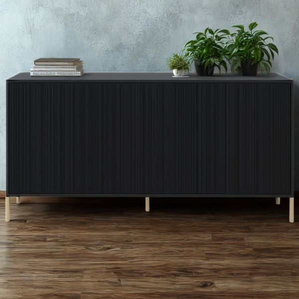 Aceasta se remarcă prin riflajele decorative de pe partea frontală, prin finisajul negru mat și prin picioarele suple aurii, care îi conferă un aspect premium.