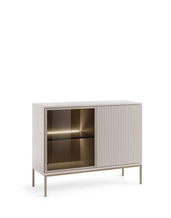 Comoda Sento (M) de la Piaski, cu geam și iluminare LED, în culoarea cașmir, este o piesă de mobilier elegantă și funcțională, ideală pentru interioarele moderne.