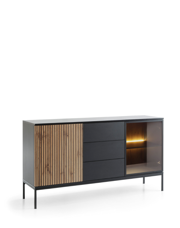 Comoda Sento cu sertare, stejar wotan de la Piaski, cu geam și iluminare LED, în culorile negru și stejar wotan, este o piesă de mobilier elegantă și funcțională, ideală pentru interioarele moderne.