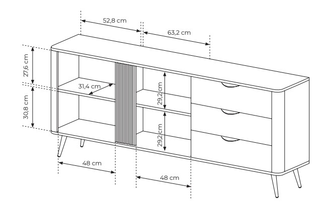 Piesa este dotată cu 2 uși cu balamale în spatele cărora se ascund rafturi încăpătoare, precum și cu 2 sertare cu extinere completă pentru depozitarea accesoriilor multimedia, a colecțiilor de DVD-uri etc.