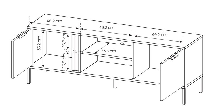 Comoda dezvăluie o compartimentare inteligentă, având două compartimente generoase cu rafturi interioare și două sertare compacte dotate cu glisiere cu extindere completă pentru o utilizare lină.