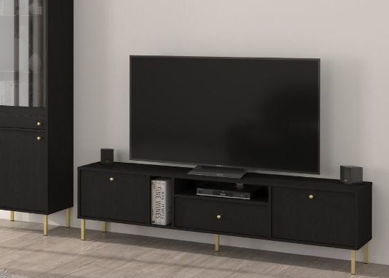 - Organizare fără efort: compartimentare inteligentă cu două uși și un sertar care ascund discret diverse obiecte, precum și două rafturi deschise pentru dispozitive și accesorii multimedia, menținând un aspect ordonat.