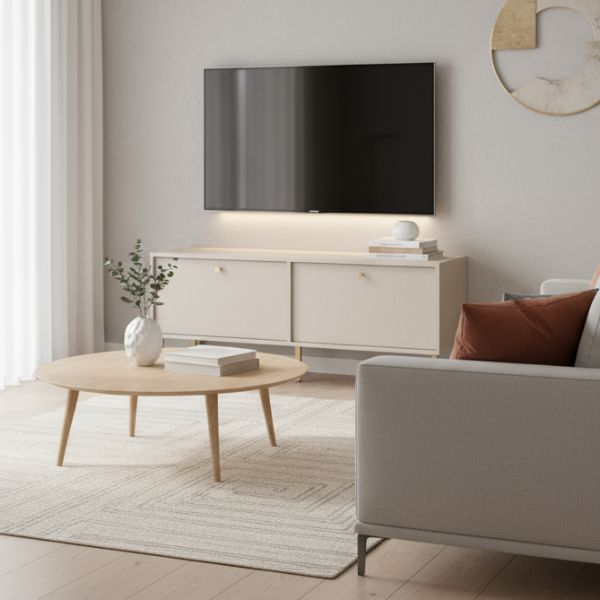 Comoda TV cu 2 uși Tokyo 2, în culoarea bej nisipiu, de la Stolarz Lempert, va aduce un suflu nou în amenajarea casei tale.