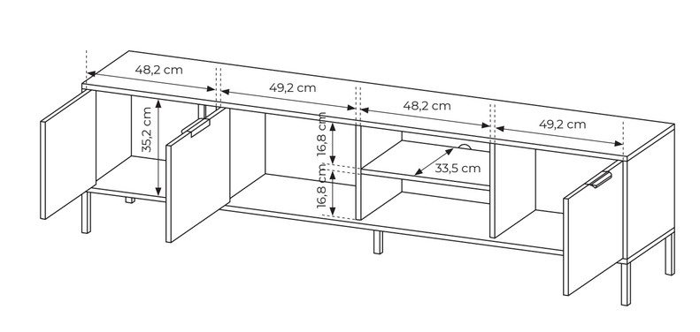 Comoda dezvăluie o compartimentare inteligentă, având două compartimente generoase cu rafturi interioare și două sertare compacte dotate cu glisiere cu extindere completă pentru o utilizare lină.