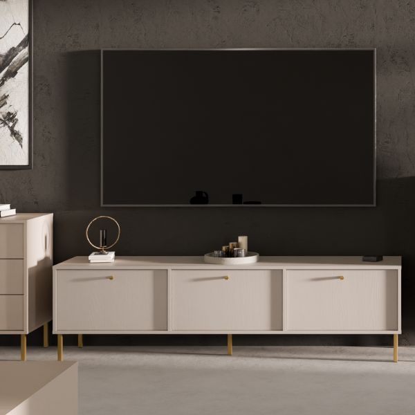 Comodă TV cu 3 uși Tokyo 2, în culoarea bej nisipiu, de la Stolarz Lempert, va aduce un suflu nou în amenajarea casei tale.