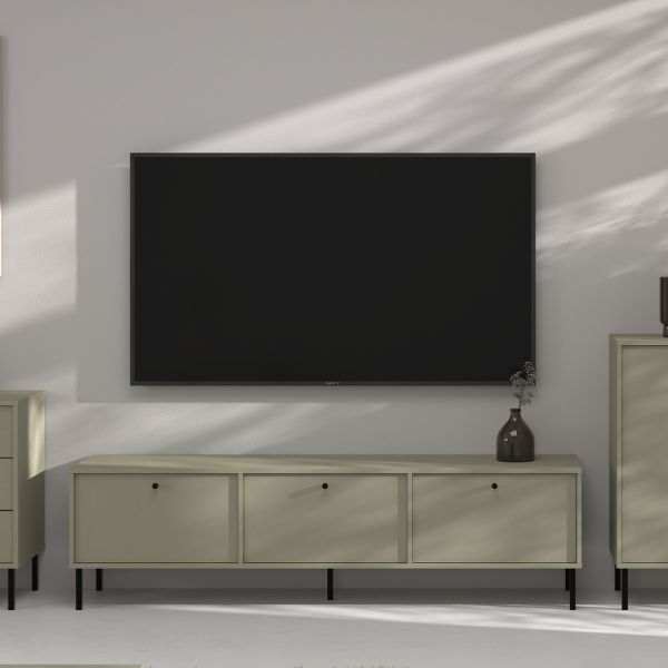 Comodă TV cu 3 uși Tokyo 2 verde eucalipt de la Stolarz Lempert, va aduce un suflu nou în amenajarea casei tale.