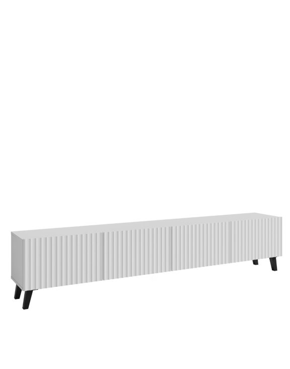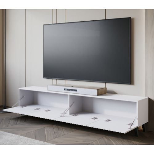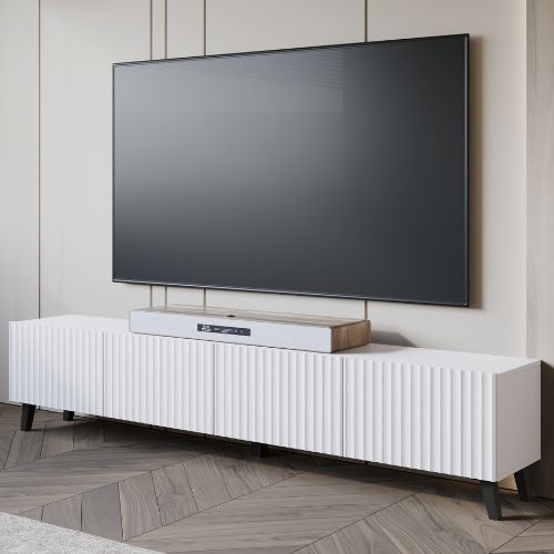Comoda TV cu 4 uși Phuket, în alb, de la Bratex, este special concepută ca soluție de depozitare pentru cei cu o viziune modernă asupra designului interior, combinând estetica actuală, rafinamentul și funcționalitatea.