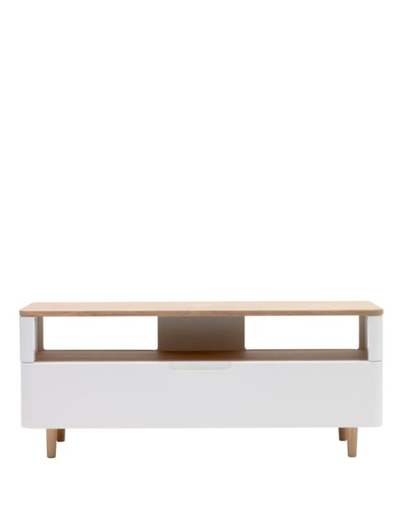 Comoda TV este dotată cu un blat, un raft expus și un sertar compact, ideale pentru depozitarea dispozitivelor multimedia.