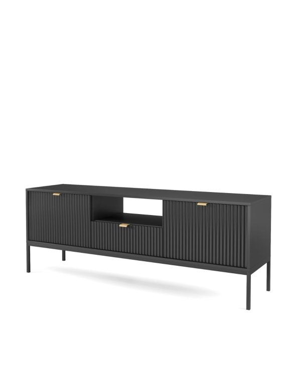 Comoda TV Nova neagră uni de la Piaski este o piesă de mobilier elegantă și funcțională, perfectă pentru amenajările interioare moderne.