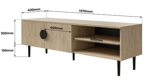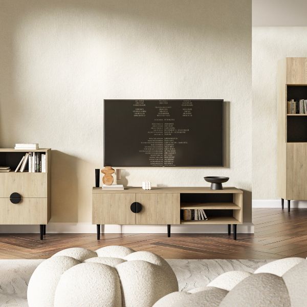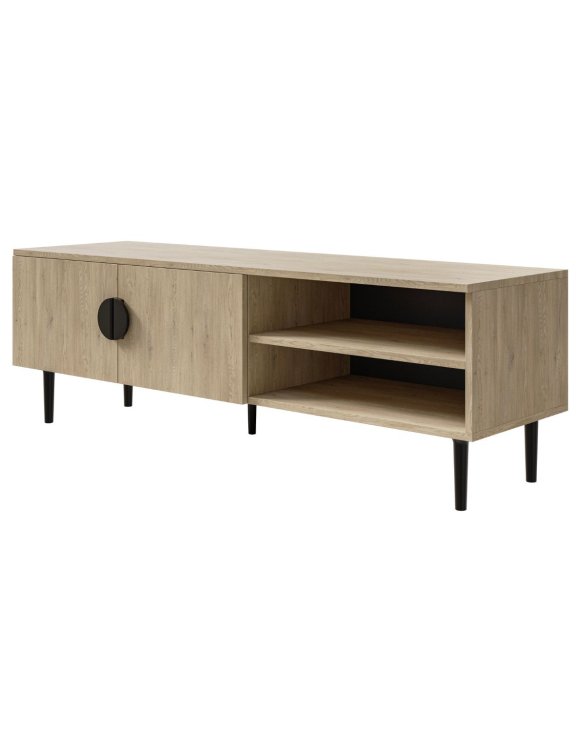 Comoda dispune de două rafturi deschise și un compartiment în spatele a 2 uși, ideale pentru depozitarea consolelor, filmelor etc.