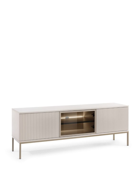 Comoda TV Sento cu geam și iluminare LED, în culoarea cașmir, de la Piaski, este o piesă de mobilier elegantă și funcțională, ideală pentru interioarele moderne.