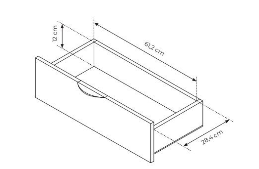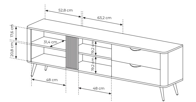 Piesa este dotată cu 2 uși cu balamale în spatele cărora se ascund numeroase rafturi, precum și cu 3 sertare cu extinere completă pentru depozitarea documentelor, textilei sau veselei.