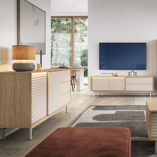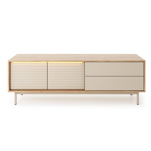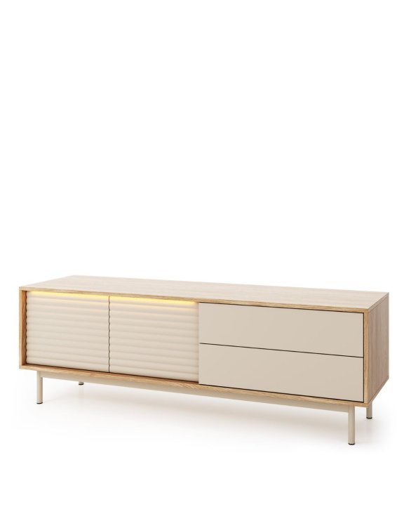 Comoda TV Tila de la Dolmar combină armonios diverse tendințe contemporane în materie de design, adăugând un plus de interes vizual în spațiului tău interior.