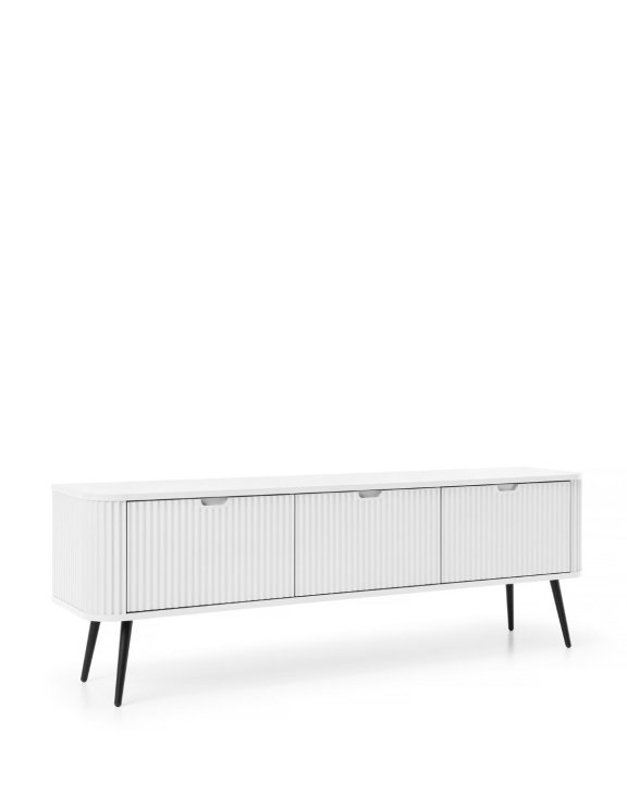 • Comoda TV Zova albă cu picioare negre de la Piaski este o piesă de mobilier modernă, cu un design rafinat.