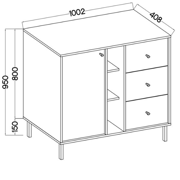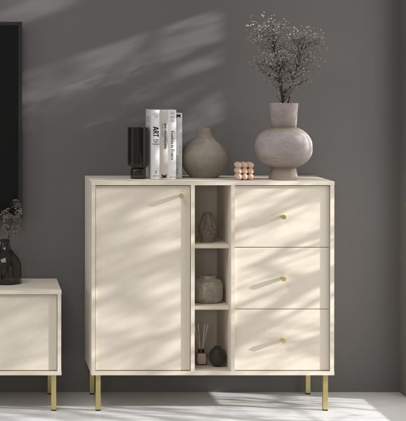 Comoda cu ușă, 3 sertare și 3 rafturi deschise Tokyo 2, în culoarea bej nisipiu, de la Stolarz Lempert, va aduce un suflu nou în amenajarea casei tale.